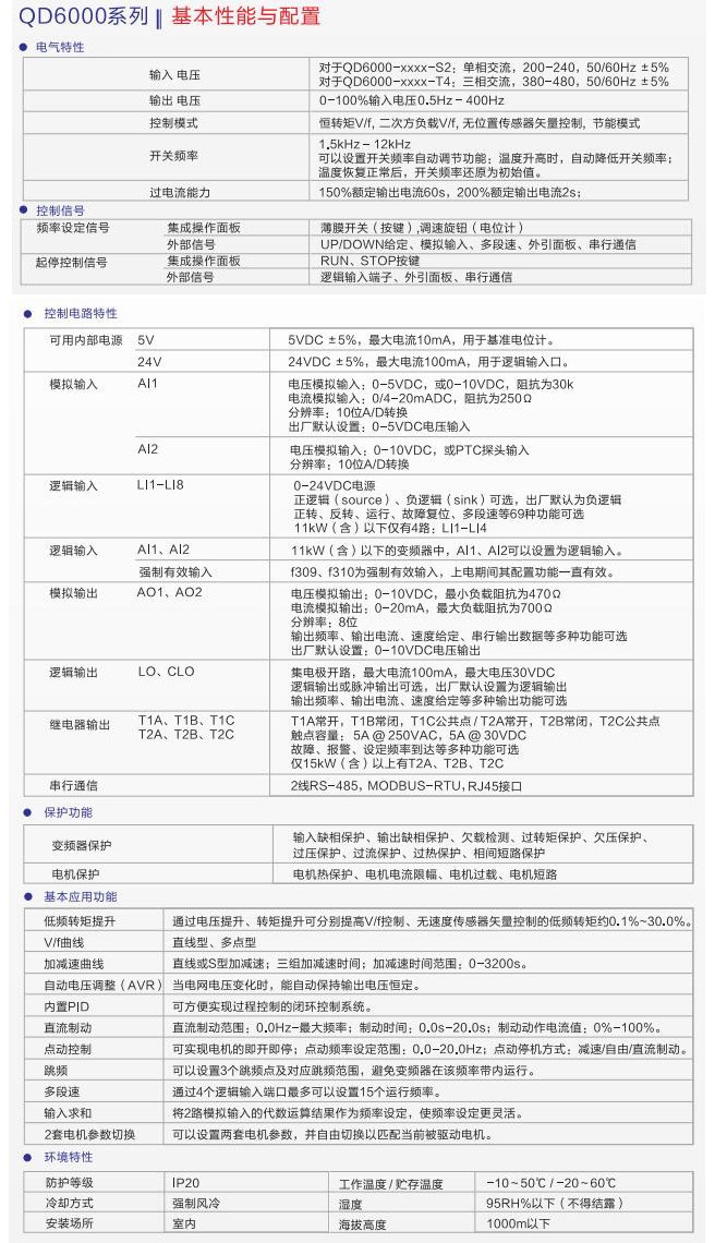 QD6000系列是VSport科技开发的新一代高性能变频器,以符合广大用户的应用需求为设计理念,具有丰富的功能,卓越稳定的性能,简洁新颖的结构。QD6000系列变频器采用了先进的无速度传感器矢量控制技术、先进的电机参数辨识、在线估计技术及先进的磁链估计技术,无论是在调速范围还是在动态响应、控制精度及低频转矩上均得到了很大的提高。
